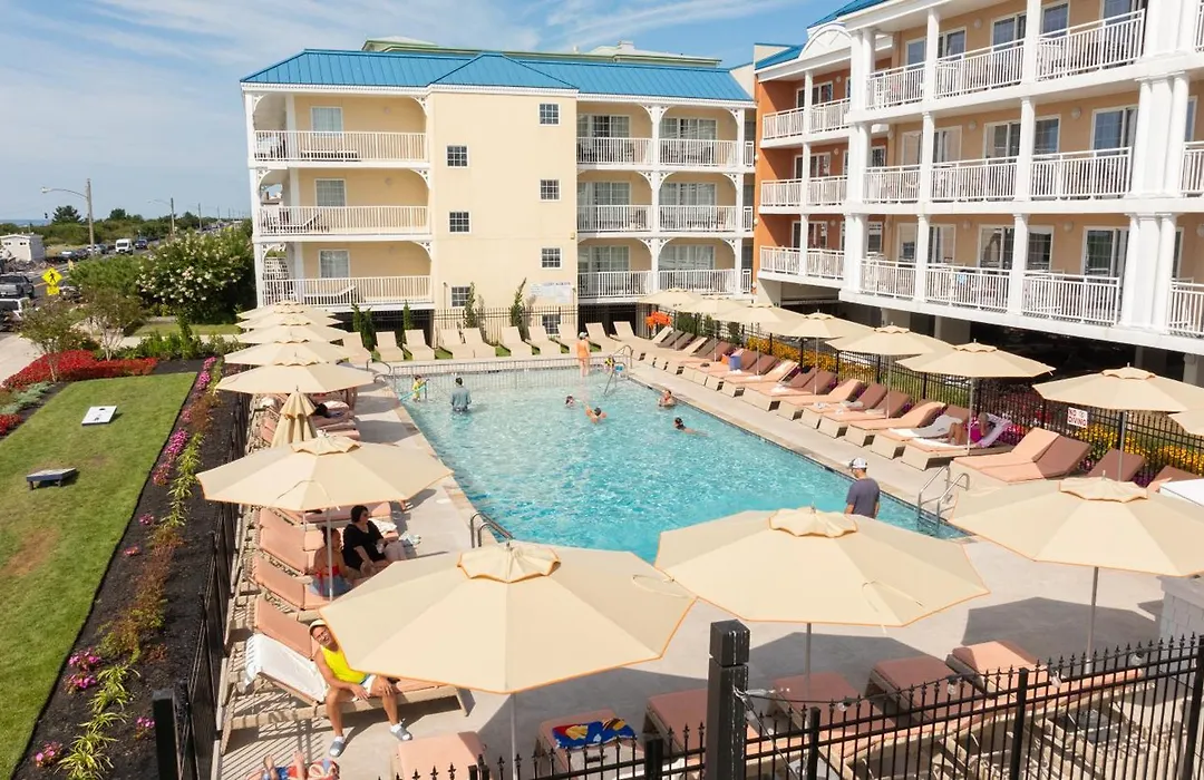 Leisure activities include complimentary beach services and access to a heated outdoor pool, complete with lounge chairs and a kiddie area. Bicycle rentals are also available for exploring the charming streets of Cape May.