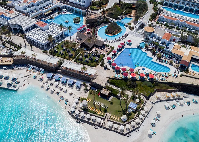 Minos Imperial Luxury Beach Resort & Spa Milatos offers a luxurious stay with a private sandy beach, an elegant Spa, and five inviting swimming pools. Rated 8.2/10 on Booking.com, this family-friendly property features a range of comfortable accommodations, including Beachfront Villas and Royal Villas.