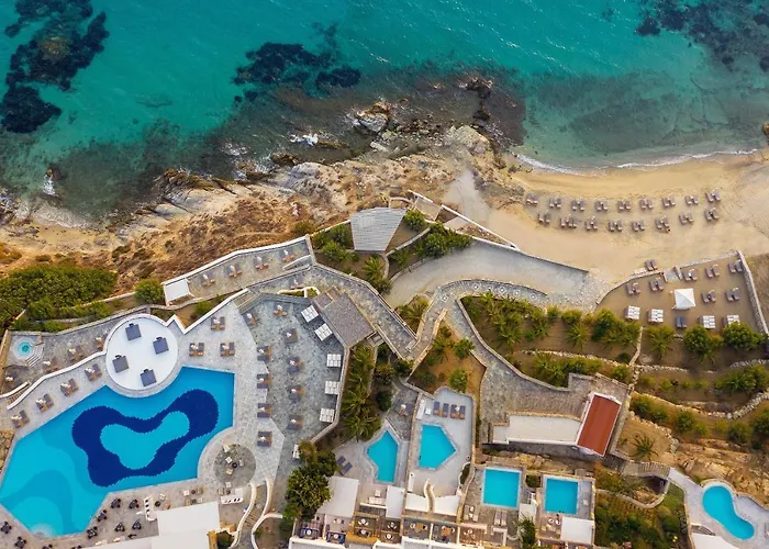 Mykonos Grand Hotel & Resort showcases luxurious beachside accommodations, featuring an expansive seawater pool and the acclaimed Althea Spa Retreat. This 5-star Agios Ioannis Diakoftis hotel offers a blend of modern luxury with traditional Greek hospitality.