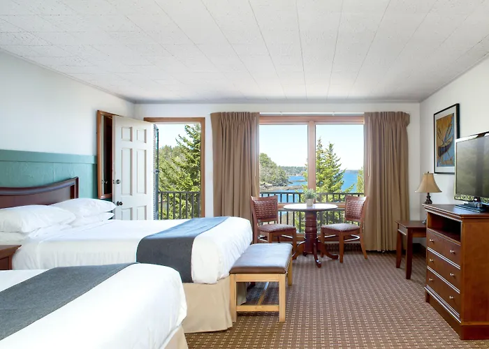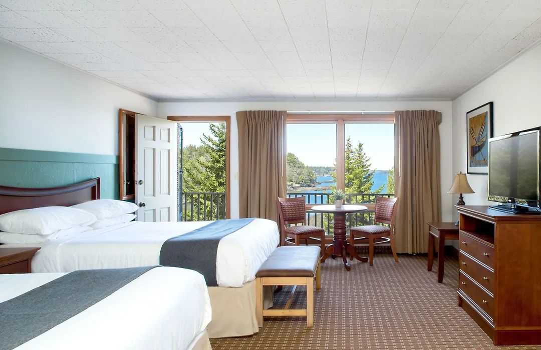 The resort is situated on 33 acres of wooded land, providing plenty of space for outdoor activities. Nearby attractions include the Coastal Maine Botanical Gardens and Burnt Island Lighthouse, enhancing the local experience.
