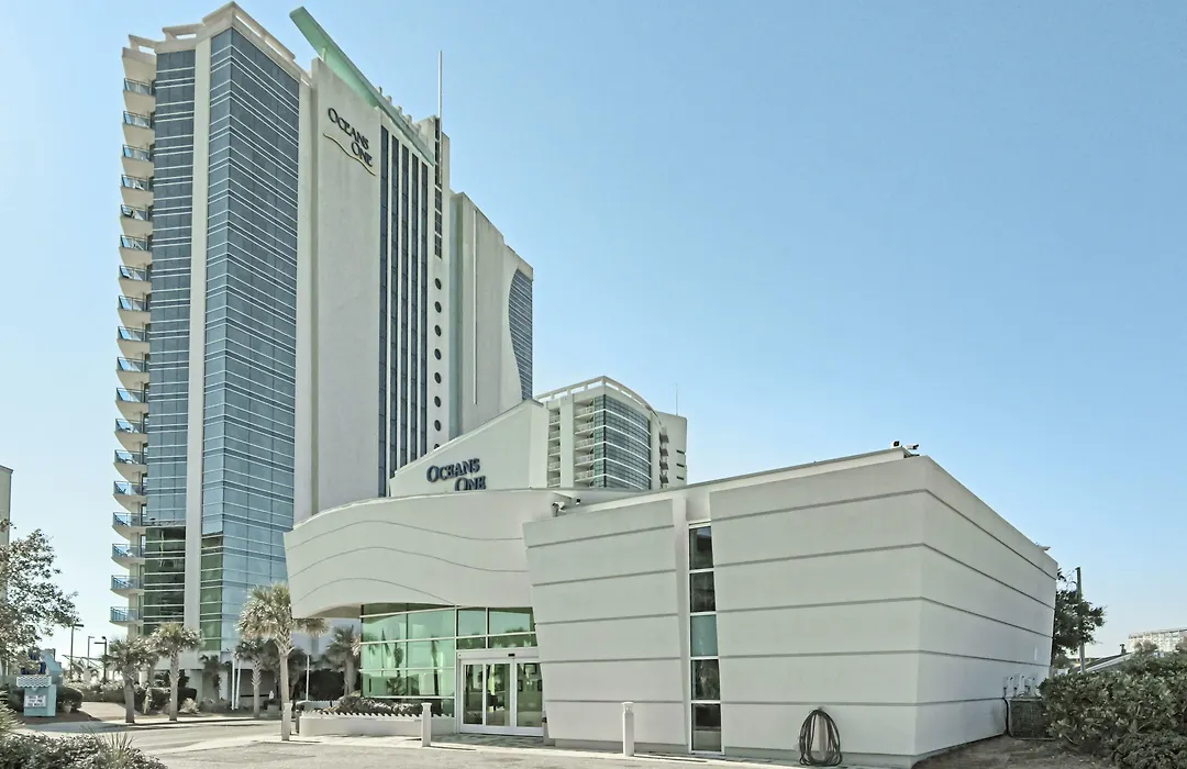 Oceans One Resort is a 3-star Myrtle Beach hotel featuring oceanfront condominiums with one to three bedrooms, ideal for family vacations. The property includes various water amenities like indoor and outdoor mineral pools, a lazy river, and children's splash area.