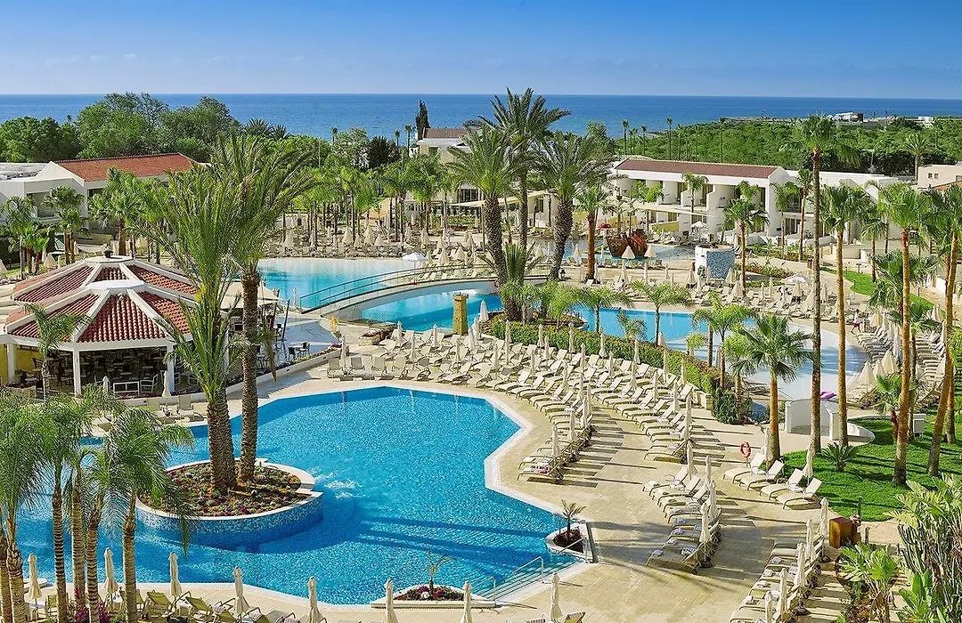 Olympic Lagoon Resort Ayia Napa offers a five-star luxury experience featuring extensive leisure facilities and a variety of dining options. This family-friendly hotel is distinguished by its beautifully landscaped gardens and a multitude of thematic pools, contributing to a comprehensive leisure environment.
