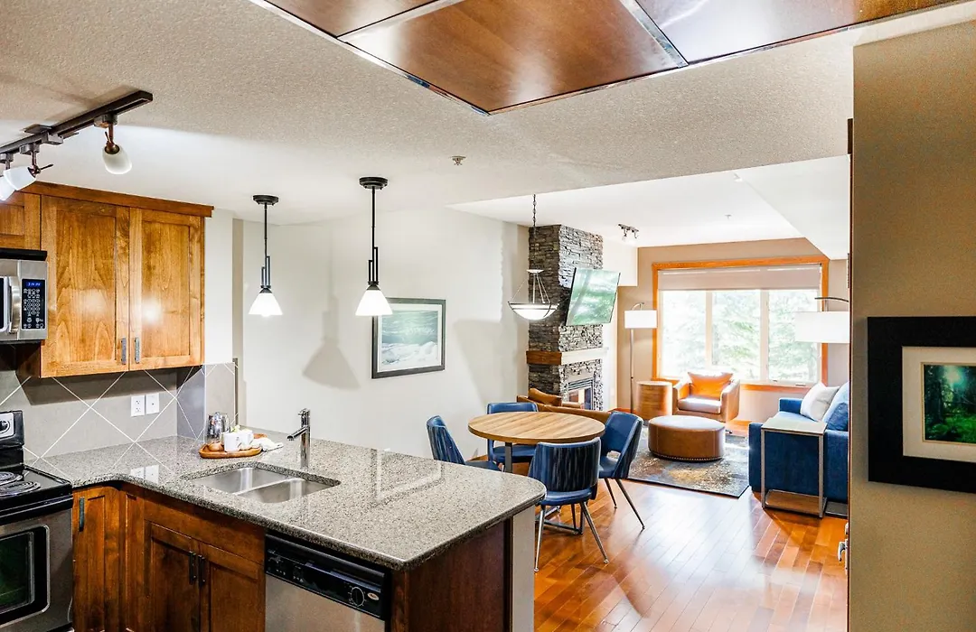 The accommodations at Stoneridge Mountain Resort include spacious one, two, and three-bedroom suites, equipped with full kitchens, high-speed Wi-Fi, and private balconies. Each suite features a cozy fireplace and luxury amenities such as spa-inspired toiletries and plush bathrobes.