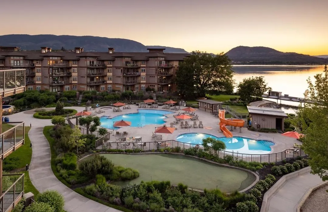 Leisure facilities include two seasonal outdoor pools, a full-service spa, and tennis courts, along with direct access to the private beach. Guests can enjoy activities such as watersports through LakeSurf Okanagan and nearby hiking trails in Glen Canyon Regional Park.