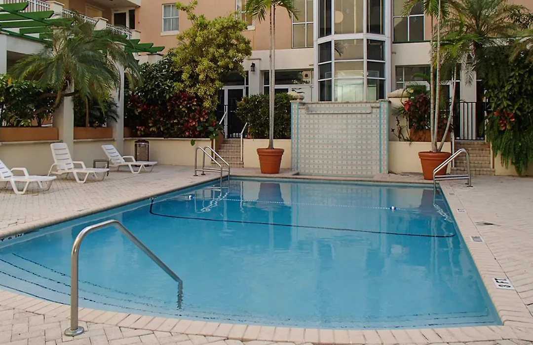 Guests can relax at the outdoor pool area, which features a courtyard with tropical landscaping and lounge chairs. The hotel is conveniently located near popular dining options like Root & Bone and The Shops at Sunset Place.