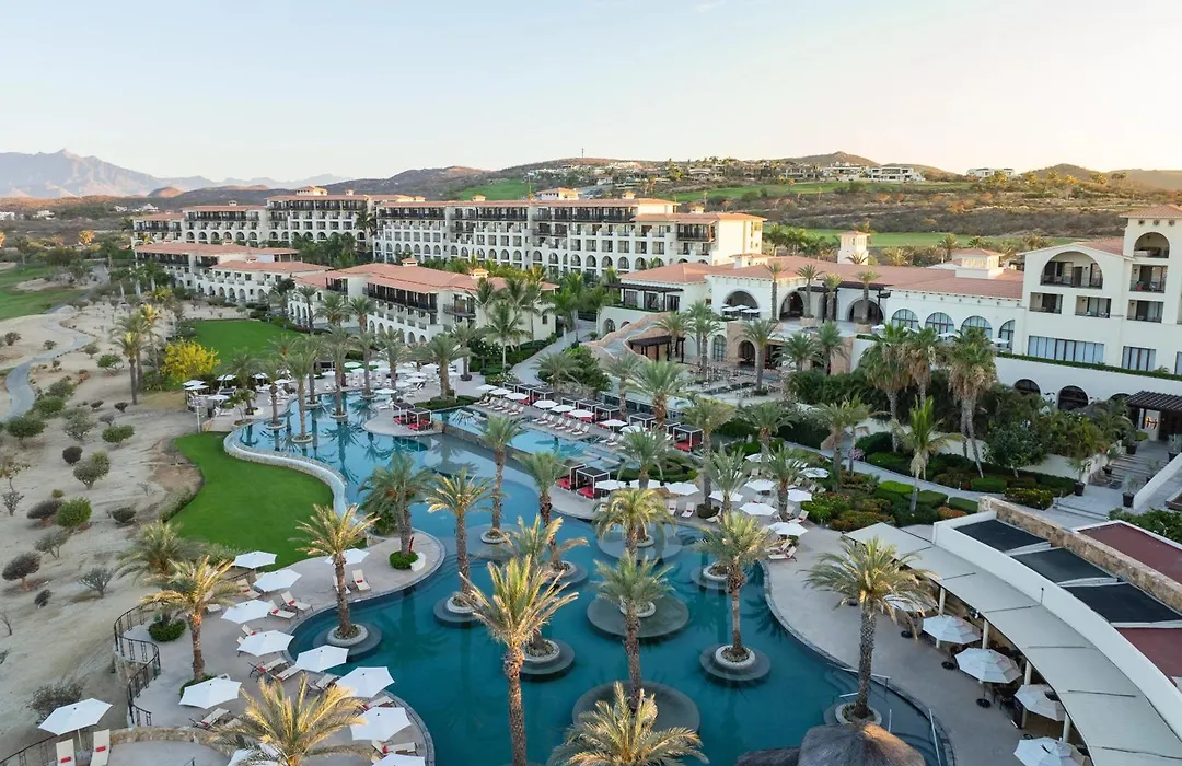 The resort features a luxury spa with 21 treatment rooms, an outdoor hydrotherapy area, and various activities such as yoga, cookery classes, and themed nights. Guests can also tee off at the adjacent Puerto Los Cabos Golf Course designed by Jack Nicklaus and Greg Norman.