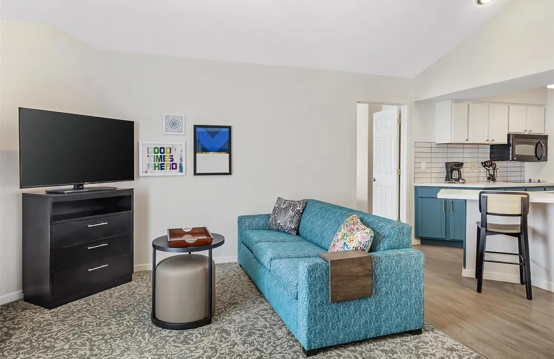 The hotel features 114 spacious, air-conditioned suites equipped with full kitchens, flat-screen TVs, and comfortable seating areas. Certain rooms have additional amenities, such as a private entrance and a sofa bed, offering flexibility for guests.