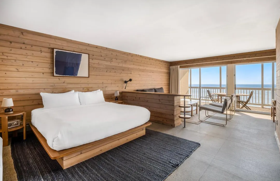 Guest rooms at Sound View Greenport feature unique designs influenced by North Fork beachside homes. Accommodations include options like suites with private hot tubs and rooms with oceanfront decks, offering various amenities such as Nespresso machines and high-speed Wi-Fi.