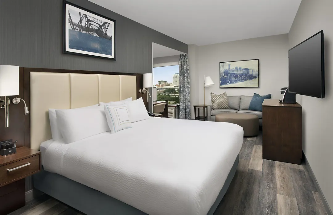 A complimentary breakfast is served daily in a modern dining area. Guests can also relax with specialty cocktails and appetizers at the lobby bar, Ann Eliza, which features live entertainment.