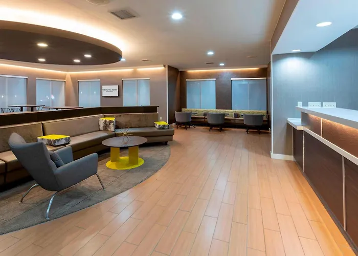 The rooms at Springhill Suites offer a modern design with amenities including a flat-screen TV, refrigerator, microwave, and a West Elm sofa with trundle. Families can enjoy spacious suites that include separate areas for working, eating, and relaxing.