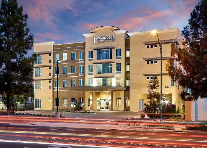 Staybridge Suites Anaheim At The Park By IHG is a 3-star hotel rated 8.6/10 on Booking.com, featuring spacious suites with full kitchens and an outdoor swimming pool. This family-friendly Anaheim hotel includes amenities such as a fitness center, shared lounge, and complimentary hot breakfast.