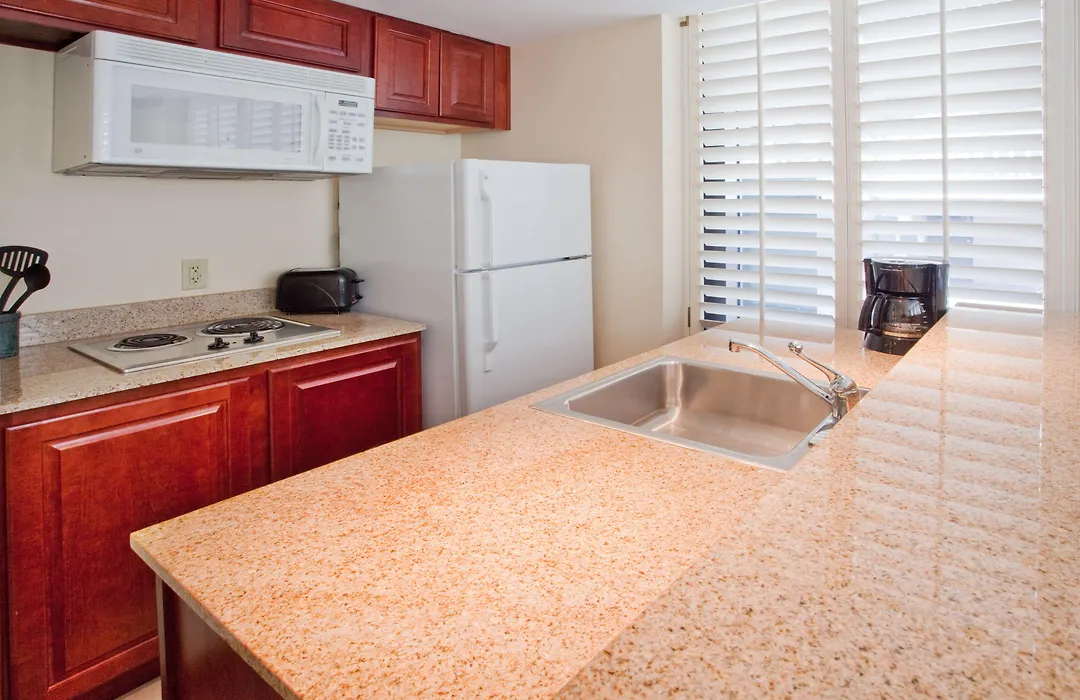 The hotel's suites include a full kitchen with supporting utensils, flat-screen televisions, and complimentary high-speed internet access. Daily housekeeping ensures rooms remain tidy, catering to both short and extended stays.