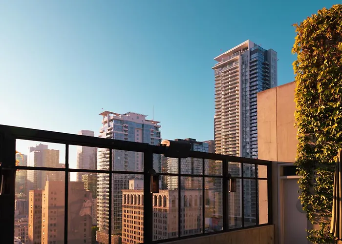 The hotel includes a rooftop bar offering sweeping views of the city alongside crafted cocktails. Nearby dining options include Om Nom Organics, Zinque, and various eateries located within a 0.3 miles radius.