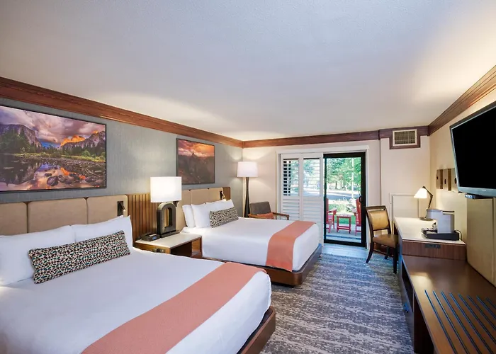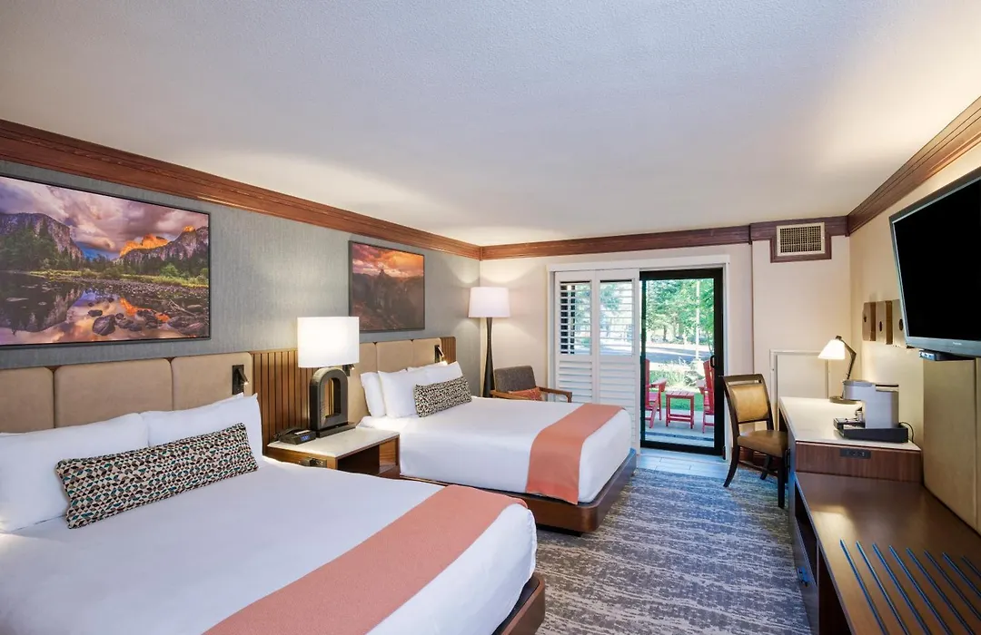 Accommodations at Tenaya At Yosemite include spacious Lodge Rooms, Cottages, and Explorer Cabins, all featuring premium bedding, air conditioning, and flat-screen TVs. The design reflects a blend of contemporary décor and rustic touches, enhancing the mountain retreat experience.