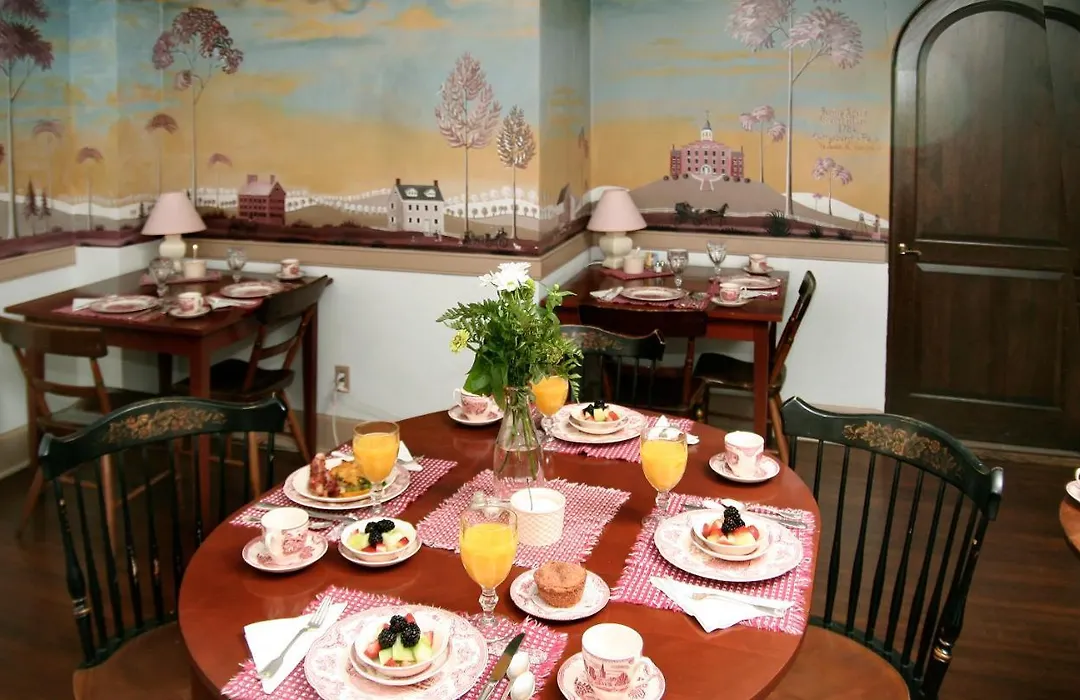 Breakfast is served daily in the historic 1815 dining room, decorated with a mural by artist Virginia McGloughlan. Guests can also enjoy outdoor seating in the garden area. Afternoon coffee, tea, and snacks are available throughout the day.