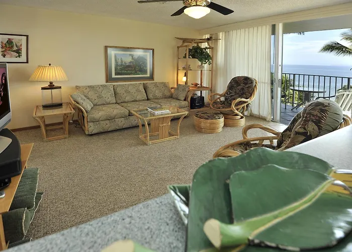 Units at The Hale Pau Hana feature private lanais with oceanfront views, separate living areas, and fully equipped kitchens, which include a refrigerator, oven, and coffee machine. Ground floor units allow direct beach access, while upper floor units provide panoramic views of the Pacific Ocean.