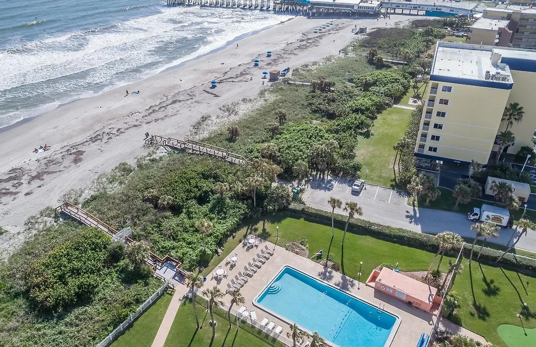 The nearest airport to Cocoa Beach Towers is Melbourne International Airport, located 25 miles away. Public transport options, including a bus stop on North Atlantic Avenue, are within a 5-minute walk for convenient access to local attractions and amenities.