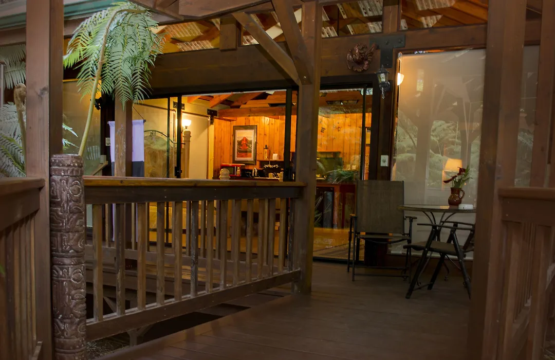 The lodge is located two miles from Hawaii Volcanoes National Park, providing quick access for hiking and exploring volcanic landscapes. Activities in the area include guided Big Island tours, visiting the Akatsuka Orchid Gardens, and exploring local sites like Rainbow Falls.