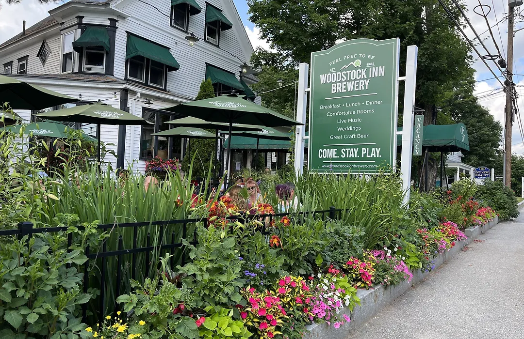 The Woodstock Inn includes a brewpub with multiple dining options, serving a range of craft beers brewed on-site. Guests can dine at the unique Dam Bar, offering outdoor seating for those enjoying warmer weather.